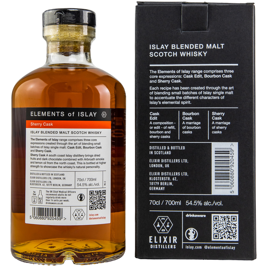 For Elements of Islay, Elixir Distillers select whiskies from all active and partially inactive Islay distilleries. The bottlers compose their delicious elemental blends from casks of different ages, sometimes from different distilleries. The goal: to capture the full spectrum of the island's malt whiskies, with their medicinal, peaty, and maritime character.