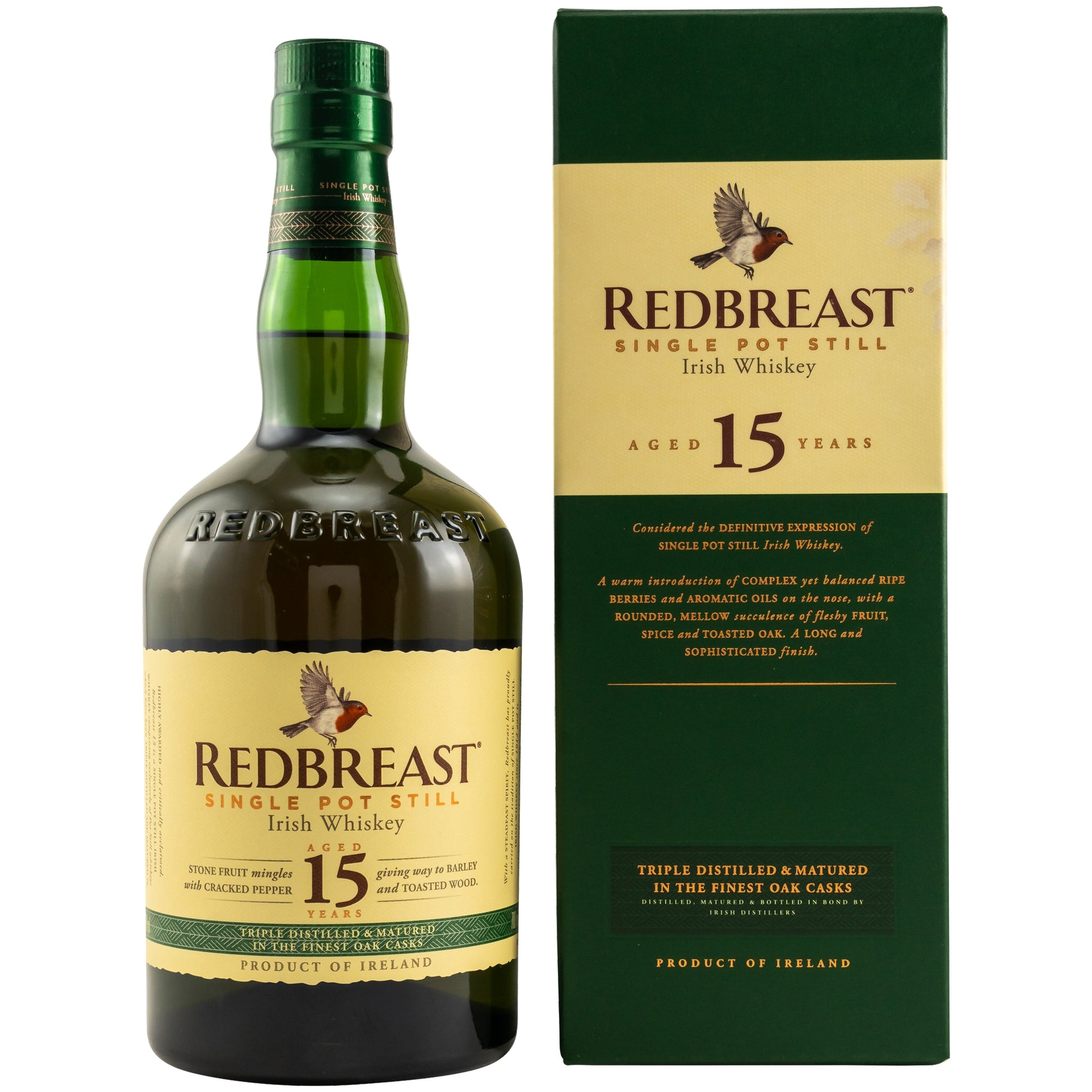 The Redbreast 15 yo is also strong and voluminous: berries and juicy stone fruit meet freshly ground pepper, which transitions to notes of grain and roasted wood.