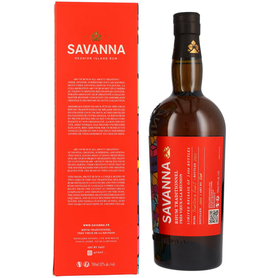 The portfolio includes unaged premium qualities for diverse drinks as well as barrel-aged rums, primarily from cognac casks. For a limited series, Savanna collaborates with contemporary artists from La Réunion, whose creativity reflects that of a master blender. The Savanna 2015/2023 – Art of Rum by VAST is the first release. It blends molasses rum from four barrels, partly distilled in a Créole still, partly in a Savalle column still, and aged for the last two years in Savanna's famously humid cellars. The result is original and vibrant, characterized by licorice, mild wood notes, and vanilla.